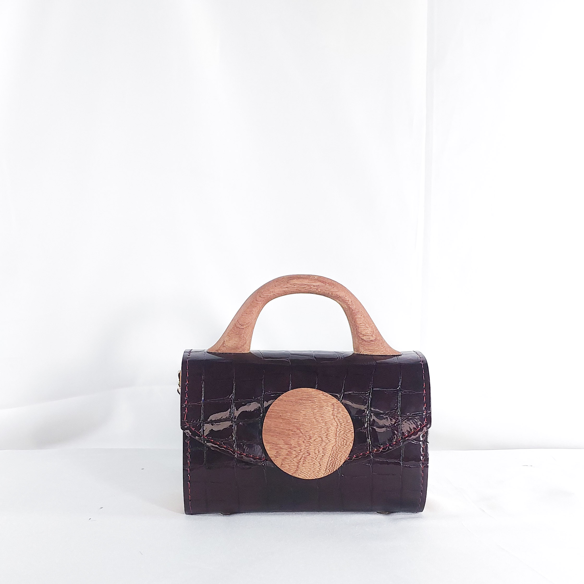 A luxe mini statement in glossy oxblood croc-textured leather with a hand-carved wooden handle and bold wooden circle accent. Minimal in size, grand in impact.