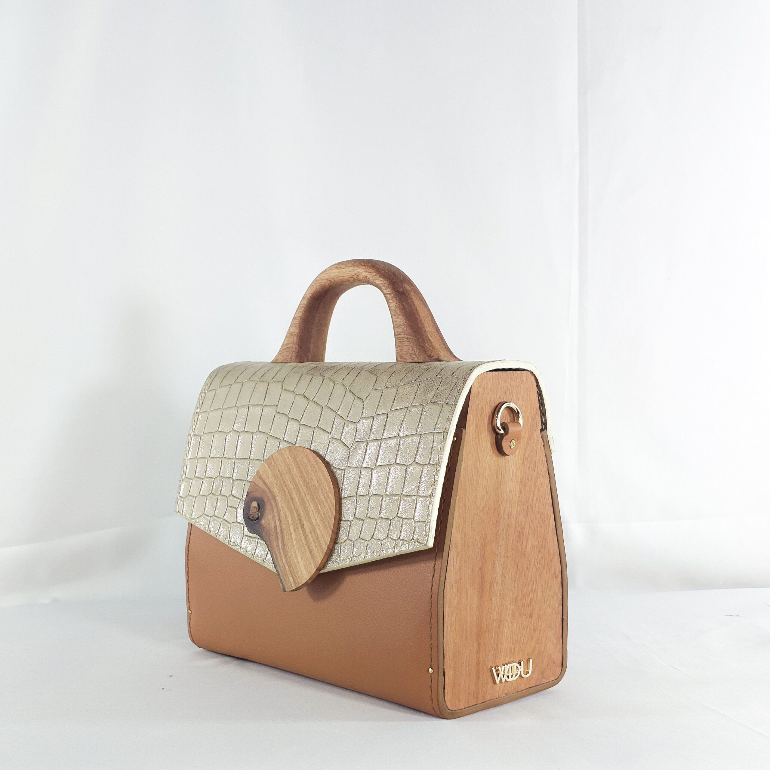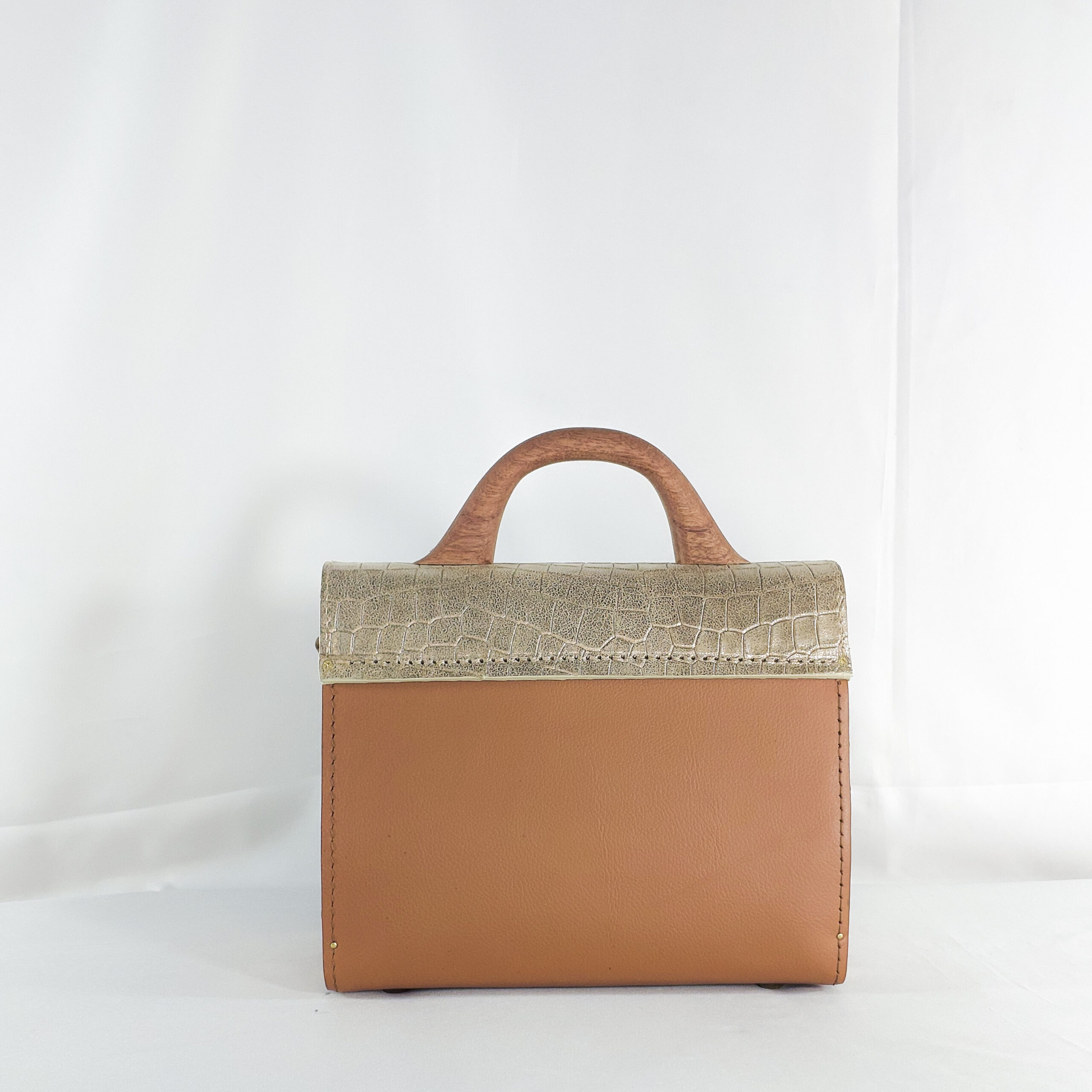 A structured top handle bag featuring a textured gold croc-embossed flap, tan leather body, and a handcrafted circular wooden flap accent that mirrors the warm wooden handle for a bold yet earthy charm.