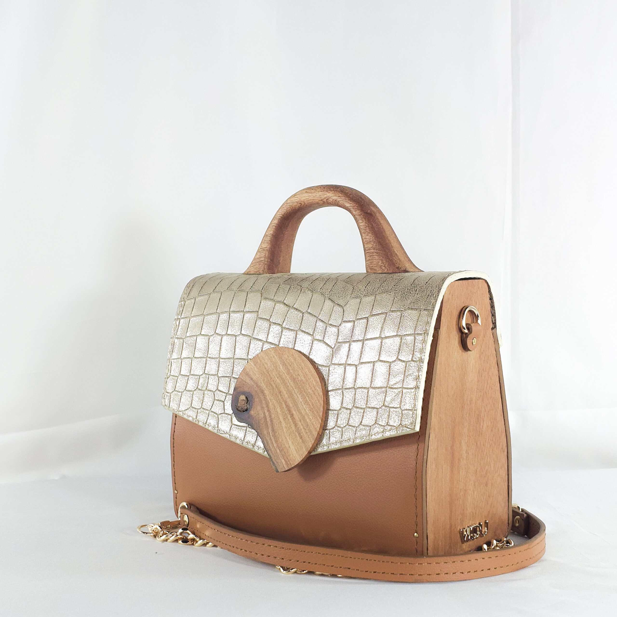 This refined top-handle bag merges natural textures with sculptural detail to create a statement accessory that?s both timeless and contemporary. The flap is crafted from metallic gold croc-embossed leather that adds a luxe, tactile contrast to the smooth, warm tan leather base. A circular wooden flap accent?complete with a natural knot detail?anchors the design, doubling as a secure closure and a piece of organic art. The gracefully arched wooden handle continues the earthy narrative, offering a warm, tactile hold. With its angular flap cut and rich material interplay, this bag is ideal for the modern muse who values originality, craftsmanship, and quiet sophistication.