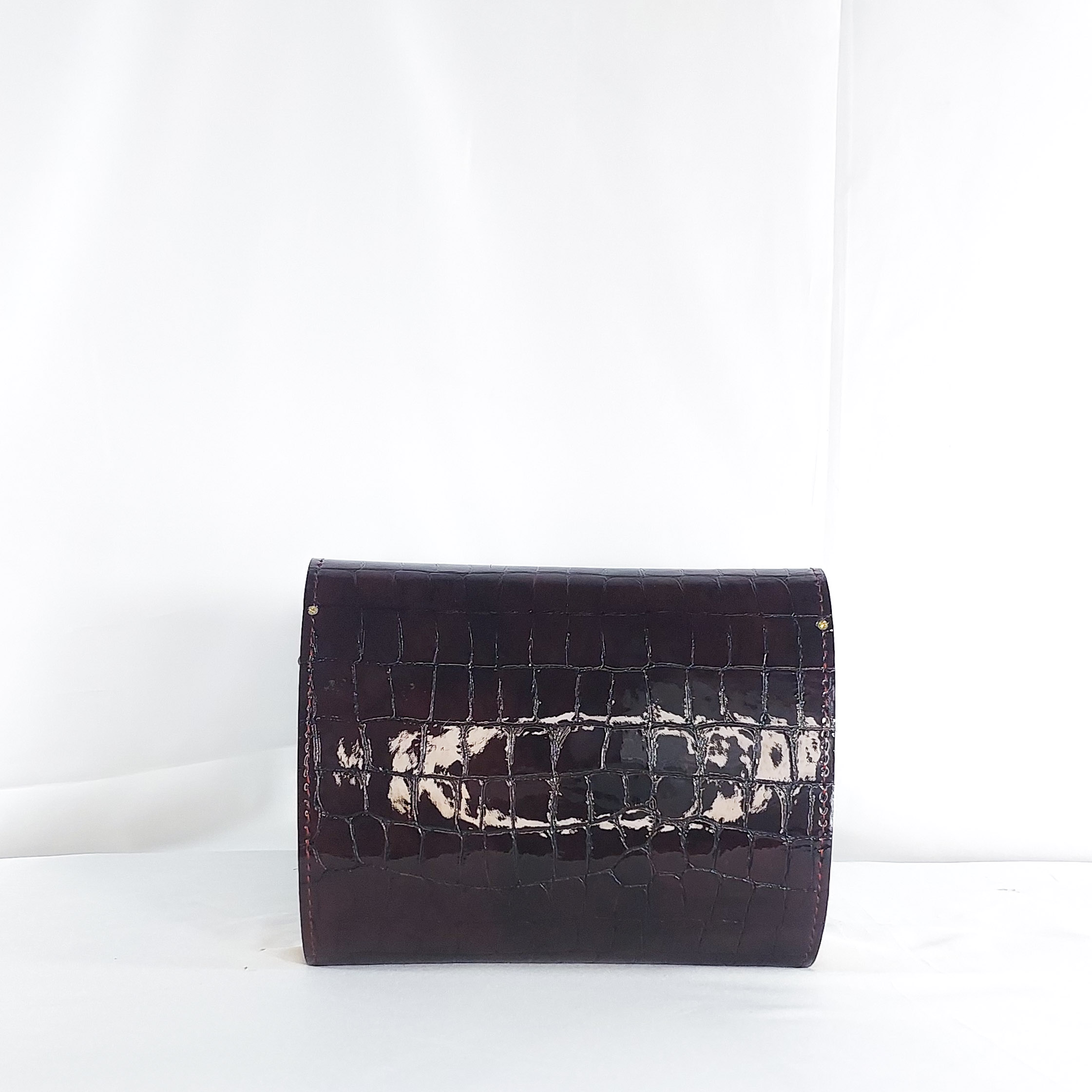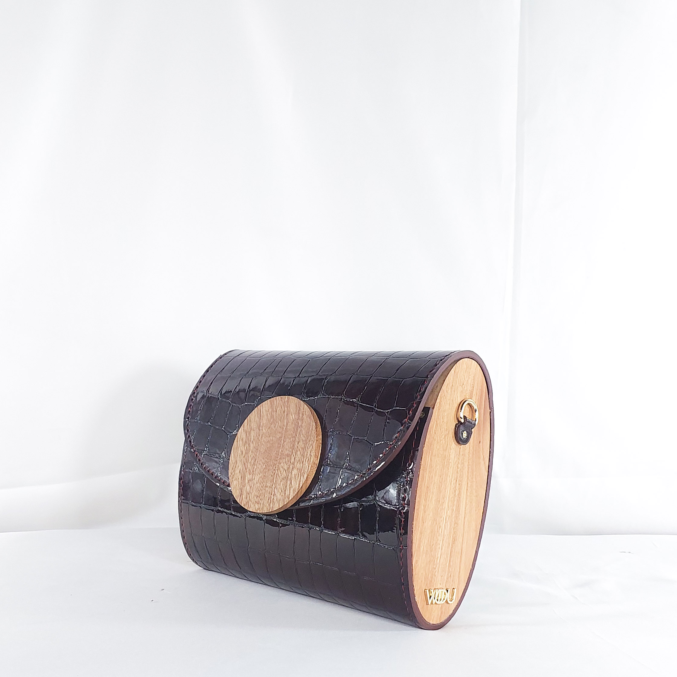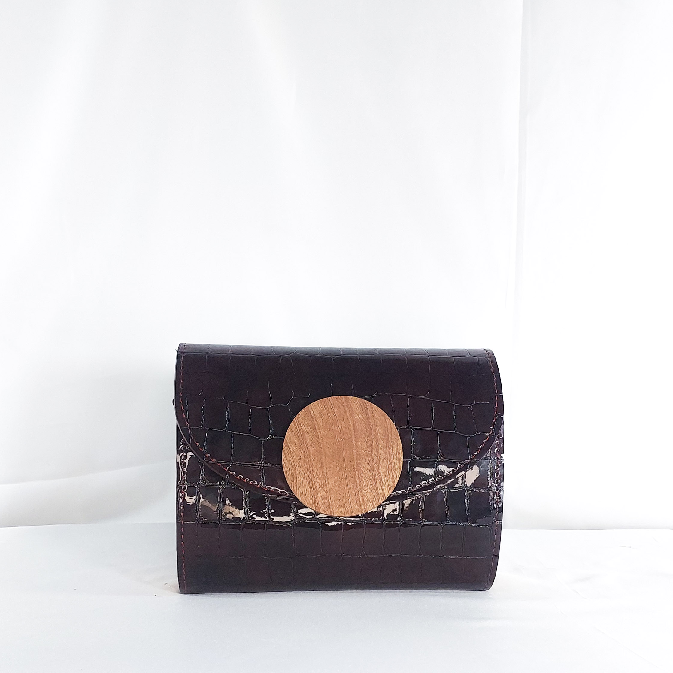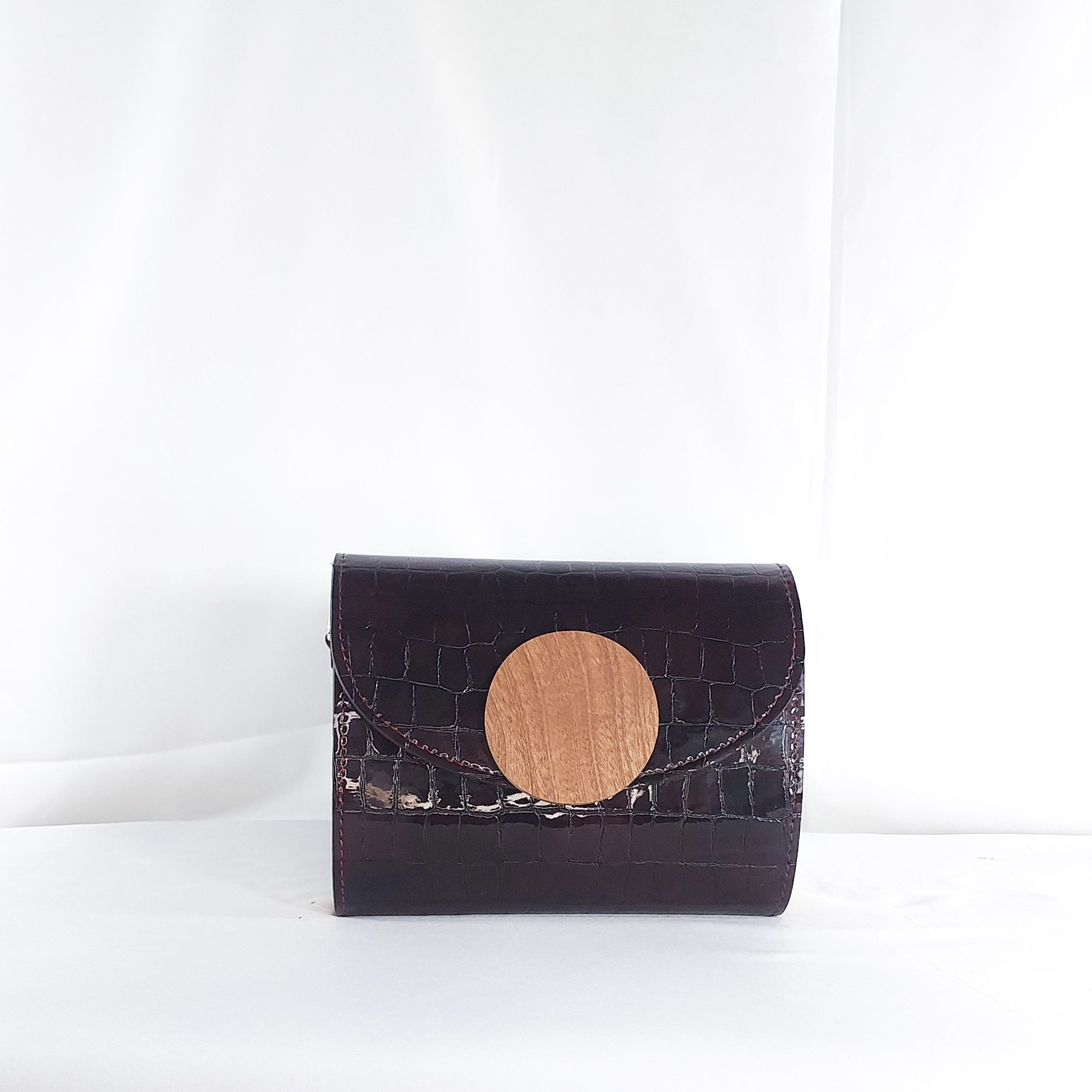 This Klenam clutch in deep wine is a refined companion for the bold and discerning. Meticulously crafted from high-gloss croc-embossed leather, this clutch pairs timeless structure with organic artistry. Its curved flap is adorned with a smooth circular wooden accent?carved to showcase natural grain and warmth, offering a striking contrast to the sleek texture beneath. Whether held by hand or tucked under arm, this clutch is a wearable conversation piece for gallery evenings, cocktail hours, or cultural events. Klenam is more than an accessory?it?s a tribute to natural beauty and bold femininity.